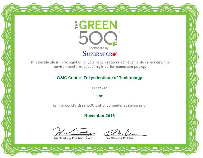 츠바메 KFC 슈퍼 컴퓨터, 그린 500에서 1위 수상