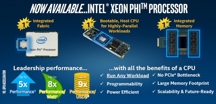 아래 이미지는 인텔에서 제시한 크게 HPC 아키텍처의 4가지 파트(컴퓨트 / 메모리&스토리지 / 패브릭 / 소프트웨어)입니다. 컴퓨트(연산)의 경우 서버용 프로세서 시장을 주도하고 있는 Xeon(제온) 프로세서가 대표적이며, 올해 출시된 인텔 제온 파이 Knights Landing (나이츠 랜딩)도 이에 해당됩니다. 이외에도 Infiniband EDR의 대항마로서 선보인 100Gbps의 Omni-Path (옴니패스) 패브릭이나 NVMe(Non-volatile Memory Express; 비휘발성 메모리) SSD 역시 HPC 분야를 타깃으로 하고 있습니다.