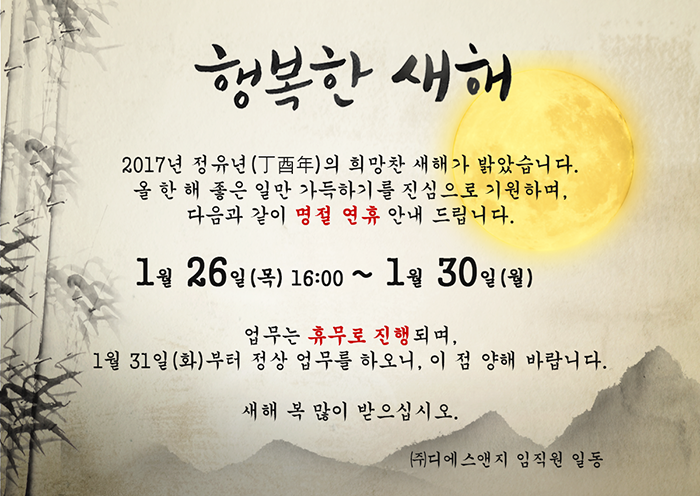 설 연휴로 1월 26일(목) 16:00부터 1월 30일(월)까지 업무가 휴무로 진행되오니, 이 점 양해 바랍니다.