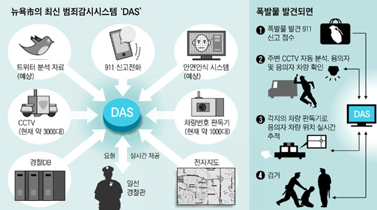 DAS 시스템은 2012년 8월 첫 시연되었는데, 이를 통해 구체적인 내용을 알 수 있습니다. 시연 내용은 다음과 같습니다. 우선, 시민이 뉴욕 911 긴급 전화로 "누군가가 맨해튼 유니언스퀘어 근처에 밀봉된 위스키 상자를 놓고 갔는데 폭발물이 든 것 같다"라는 폭발물 의심 신고를 합니다. 그러면 신고 전화가 접수되면서, 음성으로 접수된 신고 내용은 곧장 경찰 상황실 모니터에 활자로 표기되는 동시에 상자의 위치가 표시된 지도가 화면에 나타납니다. 경찰관이 지도 위에서 해당 지점을 클릭하면, 반경 150미터 이내에 있던 모든 CCTV 카메라에 신고 직전 30초간 촬영된 내용이 한꺼번에 나타납니다. 이 중 한 화면에 누군가 차를 세운 뒤 문제의 상자를 놓고 가는 장면이 남아 있는 걸 발견하고 화면에 나타난 차량번호를 확인해 입력하면 시내 전역의 차량 번호판 인식기 기록을 바탕으로, 해당 차량이 이동한 과거와 현재의 경로가 모두 표시됩니다. 그리고 나서 즉각 가장 가까운 경찰 순찰차에 체포 명령이 떨어집니다.
