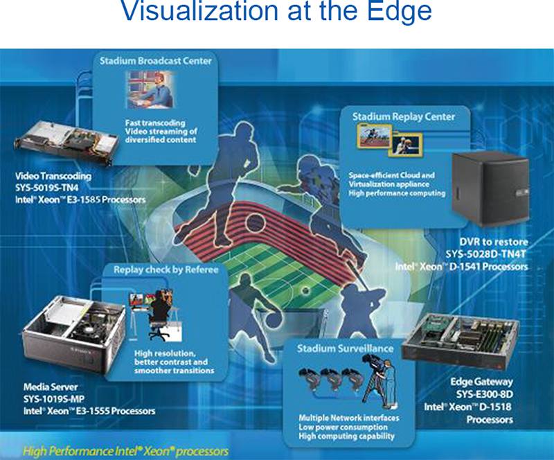 경기장에서 실시간 생중계를 해야 하는 스포츠와 같이 현장에서 바로 시각화 작업을 하는 경우에, 슈퍼마이크로는 고성능의 Intel Xeon 및 Xeon-D 기반 솔루션을 추천합니다. 일반적으로, 경기장에서는 실시간으로 영상 작업이 필요한 곳이 방송 센터에서 보안용 CCTV까지 다양합니다. 경기장 방송 센터에서는 중계 및 해설과 함께 다양한 콘텐츠의 영상을 스트리밍 하는데, 이를 위해 빠른 트랜스코딩이 필수적입니다. 이러한 비디오 트랜스코딩 용 서버로는 Intel Xeon 프로세서를 기반으로 한 SYS-5019S-TN4가 주로 사용됩니다. 또한, 심판이 정확한 판정을 내리기 위한 비디오 판독용 미디어 서버(SYS-1019S-MP) 역시 Xeon 프로세서를 기반으로 합니다. 미디어 서버는 정확성이 가장 중요하기 때문에, 높은 화질과 우수한 콘트래스트(대조) 그리고 매끄러운 트랜지션이 필요합니다. 이처럼 빠른 처리와 높은 해상도가 필요한 환경에는, Intel Xeon 서버 중에서도 Iris Pro 그래픽이 내장된 Skylake-H 프로세서 기반 솔루션이 제안됩니다.