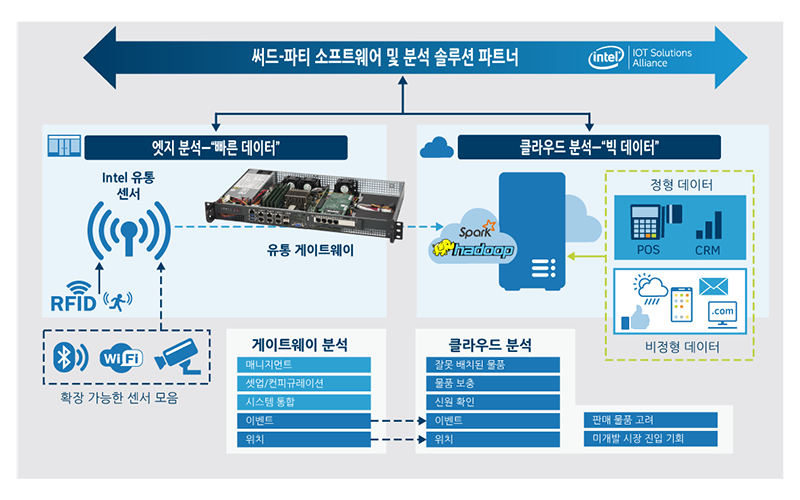 유통업계에는 제품을 광고하고 이벤트를 알리는 등의 역할을 하는 디지털 사이니지와, 물건 계산 시 사용되는 POS 기기를 비롯하여 다양한 IoT/임베디드 솔루션이 적용됩니다. 슈퍼마이크로는 인텔의 IoT 솔루션 파트너로서, 유통 산업에 있어 인텔에서 제공하는 각종 센서와 이를 저장하고 분석할 클라우드를 연결하는 게이트웨이 시스템을 제공합니다. 아래 이미지에서 볼 수 있듯이, 우선, 인텔에서 제공하는 RFID를 비롯한 각종 센서를 매장 곳곳에 설치합니다. 이러한 센서는 블루투스, 와이파이, CCTV와 같은 여러 센서들로 확장 가능하며, 이 경우 훨씬 더 다양하고 많은 데이터를 수집할 수 있게 해줍니다. 슈퍼마이크로가 제안하는 게이트웨이 서버(SYS-5018D-FN8T)는 고성능 Xeon D 프로세서를 기반으로 하여, 실시간으로 데이터를 분석 가능합니다. 게이트웨이 서버는 센서를 통해 수집된 이벤트 및 위치 데이터를 일차적으로 분석하는 역할을 합니다. 이후, 게이트웨이를 통해 모든 데이터는 데이터 센터에 구축된 클라우드로 전송 및 저장됩니다.