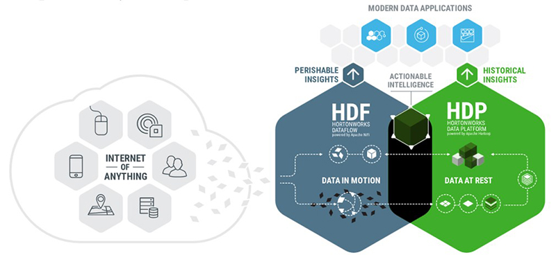앞서 소개한 사례들과 같이, IoT는 이미 많은 산업분야에서 유용한 정보를 제공하고 있습니다. 다양한 IoT 센서를 통해 수집된 데이터는 유의미한 인사이트를 도출하고 이를 바탕으로 사업에 주요한 의사결정을 내리는 데 사용됩니다. 이를 위해 데이터 처리, 분석 등 다양한 추가 프로세스가 필연적입니다. 호튼웍스(Hortonworks)는 북미 최고의 빅 데이터 / 하둡 솔루션 기업으로, 이러한 빅 데이터를 위한 최적화된 HDP 및 HDF 솔루션을 제공합니다. 보관 데이터를 위한 HDP와 실시간 데이터를 위한 HDF를 기반으로, 실시간 스트리밍 데이터와 보관 데이터 모두를 엔드-투-엔드로 활용할 수 있는 역량을 제공합니다. 호튼웍스의 빅데이터 솔루션으로 데이터 어플리케이션에 가치를 더하시기 바랍니다.