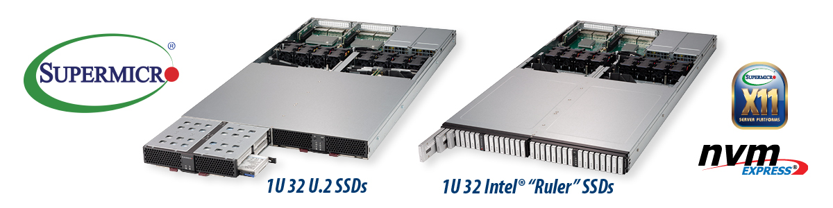 1U 시스템 내 모두 32개의 핫스왑 NVMe 드라이브를 가진 슈퍼마이크로의 새로운 NVMe 솔루션은 동사가 가까운 장래에 32TB NVMe 드라이브를 지원함에 따라 1U 랙 공간에 페타바이트 규모의 올NVMe 용량을 제공한다. NVMe 기술은 첨단 컴퓨팅을 위해 가능한 최저의 레이턴시를 구현하고 데이터 스토리지에 더 빠른 CPU를 적용하기 위해 개발되었다.