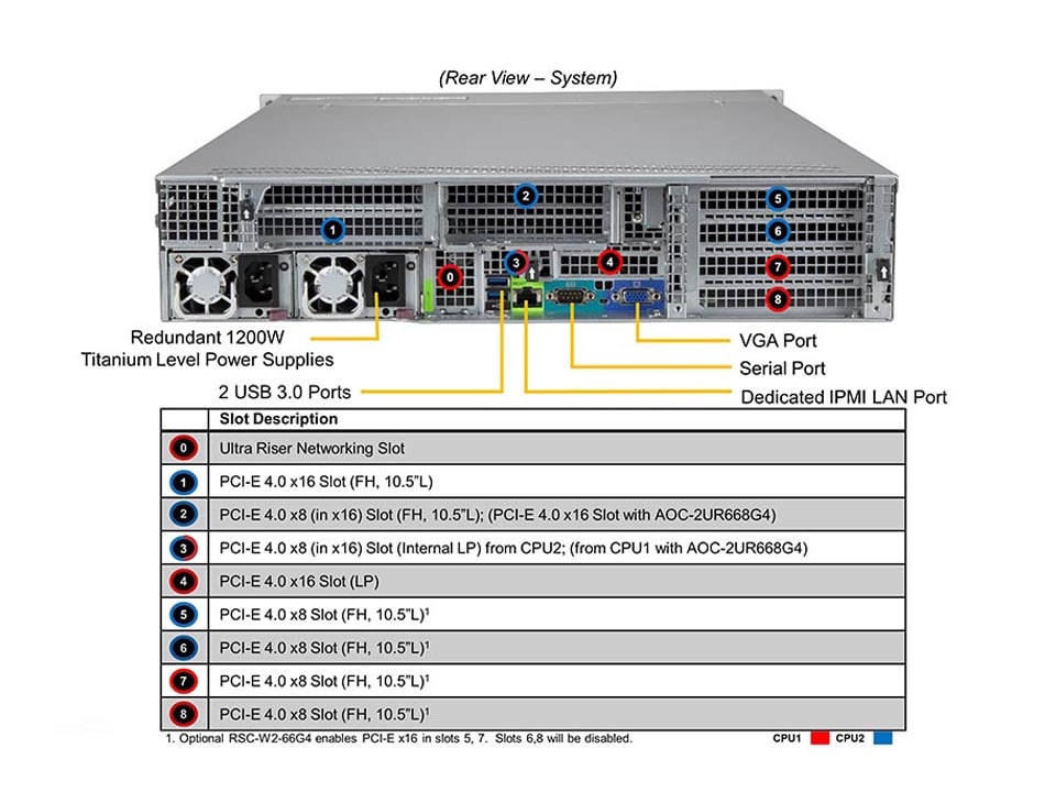 | Riser Card | RSC-W2-688G4 | 1 | 2U LHS WIO Riser card with one PCI-E 4.0 x16 and two PCI-E 4.0 x8 |