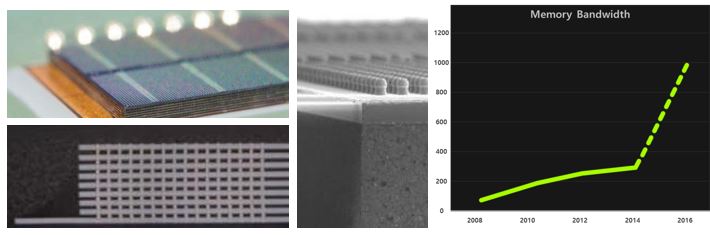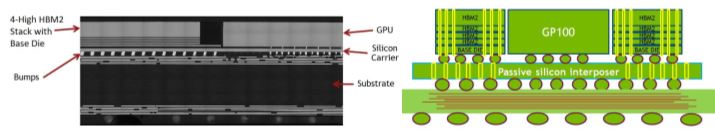 <▲ GP100 GPU와 HBM2 stack의 횡단면 현미경 사진 및 도면>