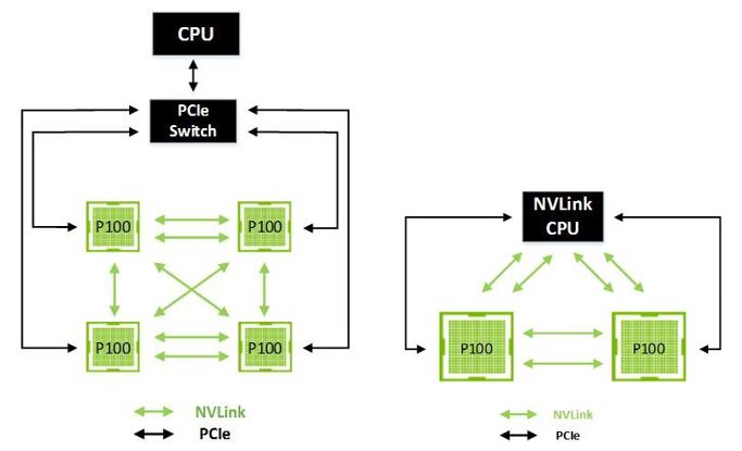 <▲ NVLink를 통한 4개 GPU 연결(좌) / NVLink를 통한 2개 GPU 및 CPU 연결: 양방향 대역폭 80GB/s(우)>