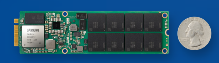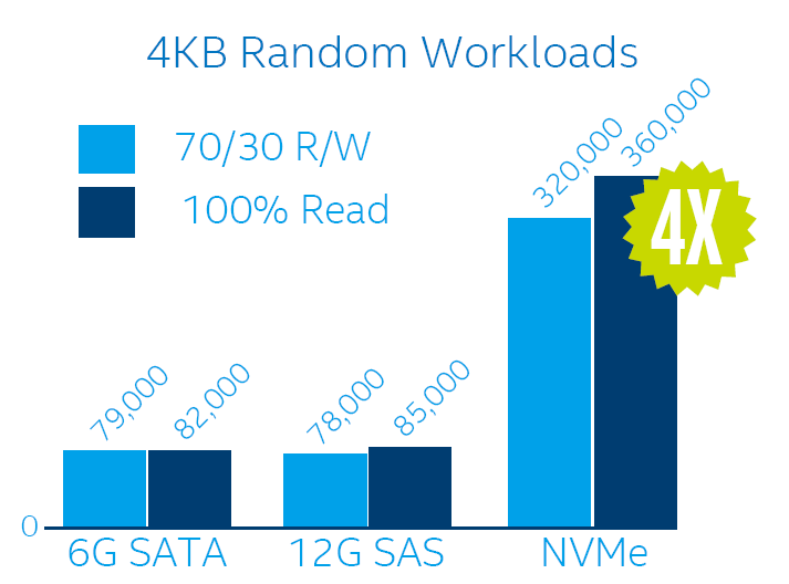 우선, NVMe(Non-Volatile Memory Express) 기술에 대해 간략히 소개 드리겠습니다. NVMe는 기존의 SATA 혹은 SAS 대비 훨씬 빠른 비휘발성 저장장치를 위한 새로운 인터페이스 사양입니다. NVMe 제품은 보통 SSD 형태로 출시되는 플래시 메모리로, PCI-Express 카드 타입 및 2.5" 폼팩터의 U.2 타입이 있습니다. 기존의 SATA/SAS HDD 혹은 SATA 인터페이스를 기반으로 한 SSD에 비해, NVMe SSD는 더 향상된 성능과 병목현상(bottlenecks)의 감소를 제공하기 때문에 점차 거대화되는 최근 데이터센터에 적합합니다. NVMe SSD가 지닌 저전력과 높은 보안성 역시 데이터센터에 들어맞는 특징입니다. Intel에 따르면, NVMe SSD는 4KB Random 워크로드에서 SATA/SAS 대비 4배 이상의 성능을 제공한다고 합니다. 이외에도 1 레인 당 1GB/s, 드라이브 당 1-16 레인이 CPU에 직접 연결되어, 우수한 대역폭을 확보하는 동시에 HBA 비용과 오버헤드를 제거할 수 있습니다.