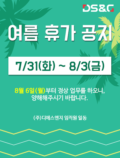 디에스앤지가 7월 31일부터 8월 3일까지 4일간 하계 휴무를 실시하오니, 이 점 양해 부탁 드립니다.