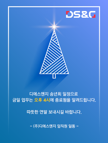디에스앤지 송년회 일정으로 금일 업무는 오후 4시에 종료되오니, 양해 바랍니다.