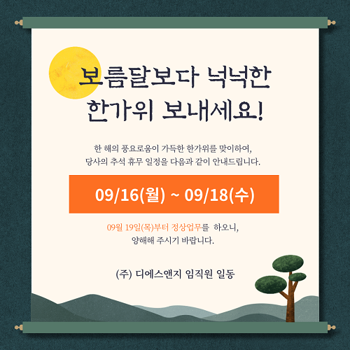 디에스앤지 추석 연휴 휴무 일정을 다음과 같이 안내드립니다.