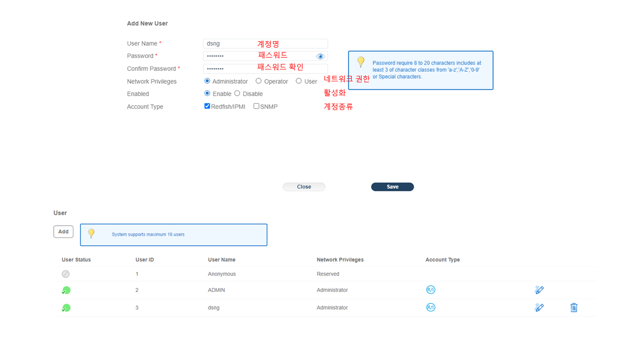 (1) User: 시스템 상태, FRU, 이벤트 로그를 볼 수 있는 기본 권한입니다.