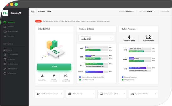 Lablup 사의 Backedn.AI는 AI와 HPC에 특화된 독자적인 GPU 중심 스케줄러를 통해 딥 러닝 친화적인 리소스 배치, 분산 처리용 다중 노트 워크로드, 데이터 I/O 병렬화를 지원하는 스토리지 프록시를 통해 컴퓨팅 리소스를 효율적으로 관리하여 최대한의 잠재력을 발휘합니다.