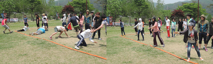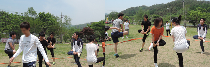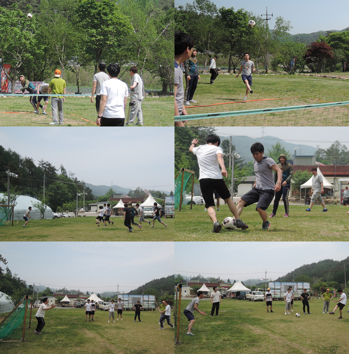 워크샵 마지막날, 운동장에 모여 팀별 체육대회가 개최되었습니다~ 족구, 축구, 닭싸움, 그리고 계주까지! 회사 업무에 임하는 열정 못지 않게 다들 최선을 다해 경기에 임했습니다! |